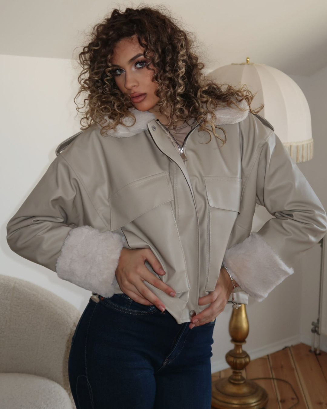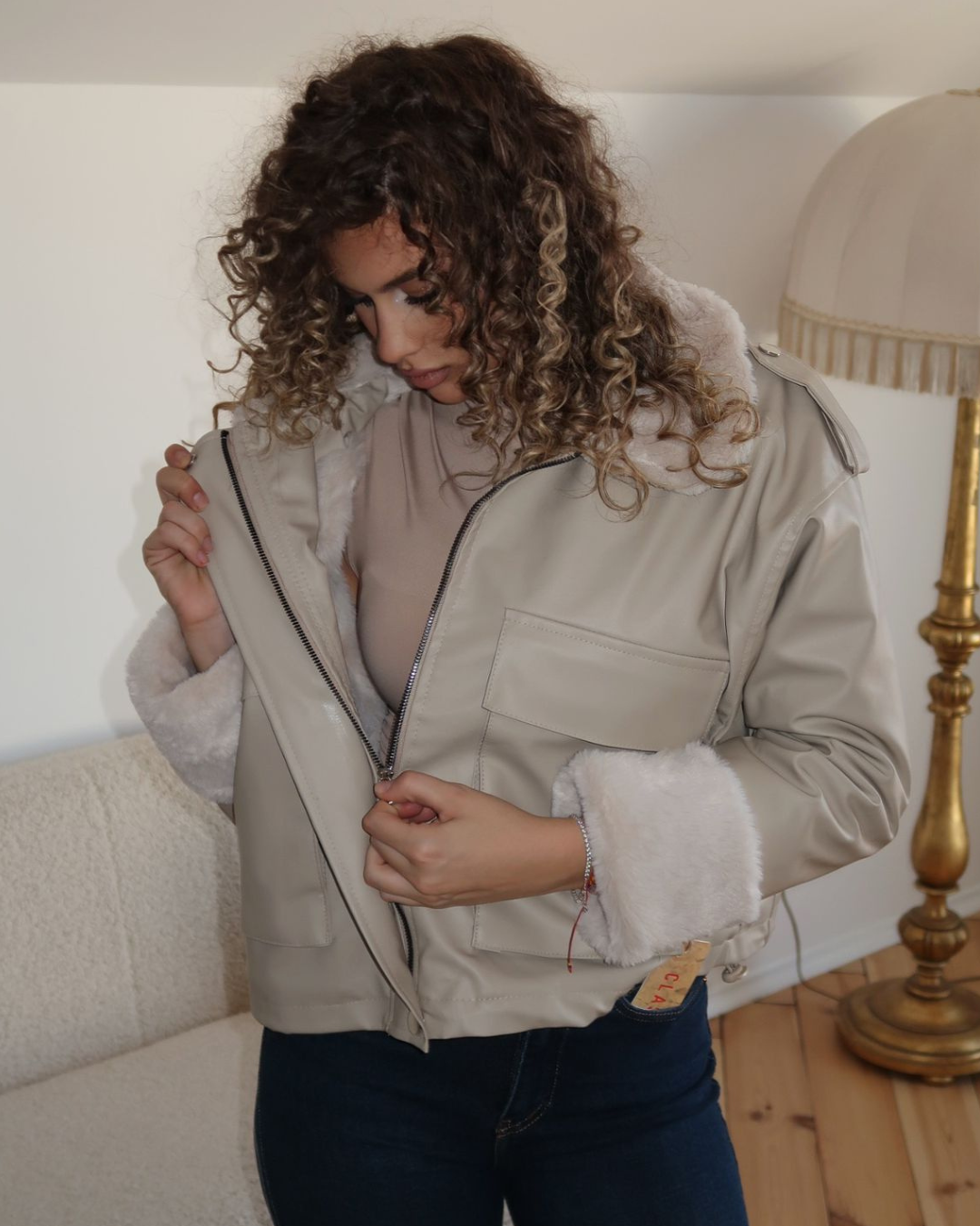 Kožna jakna sa veštačkim krznom na kragni i rukavima — moderan omaž klasičnom pilot modelu. Mekana, topla i svedeno glamurozna, savršeno se uklapa u svaki street style look.