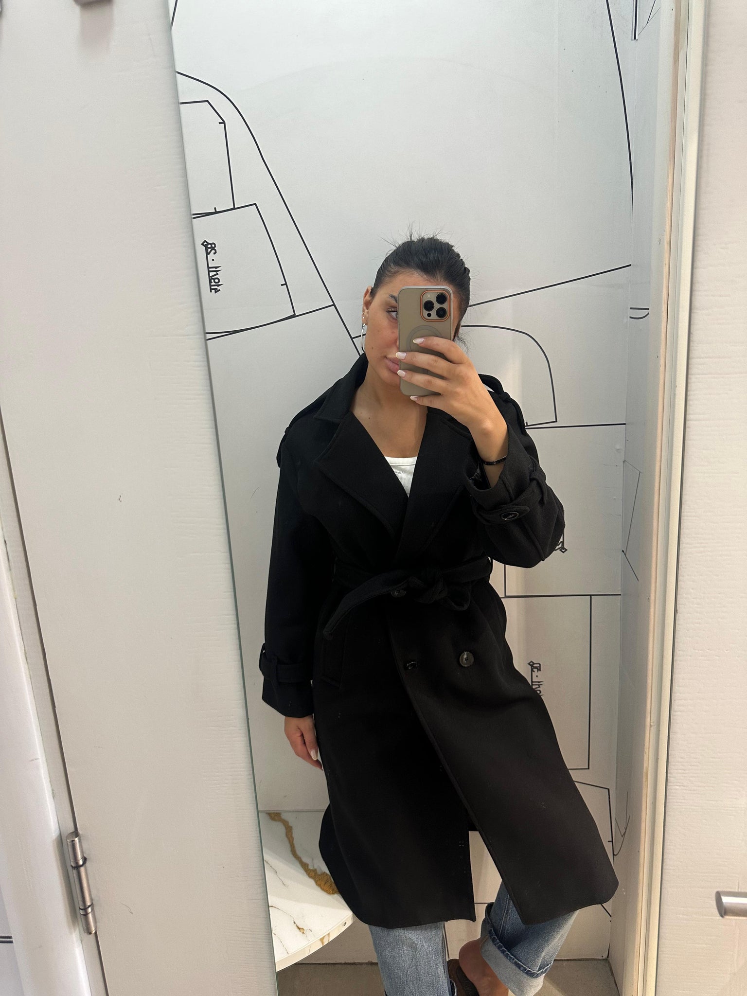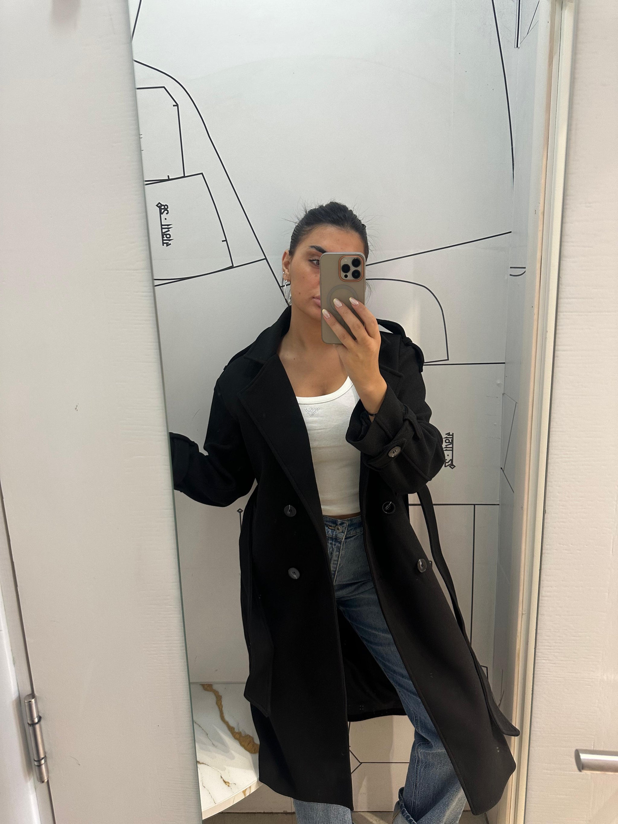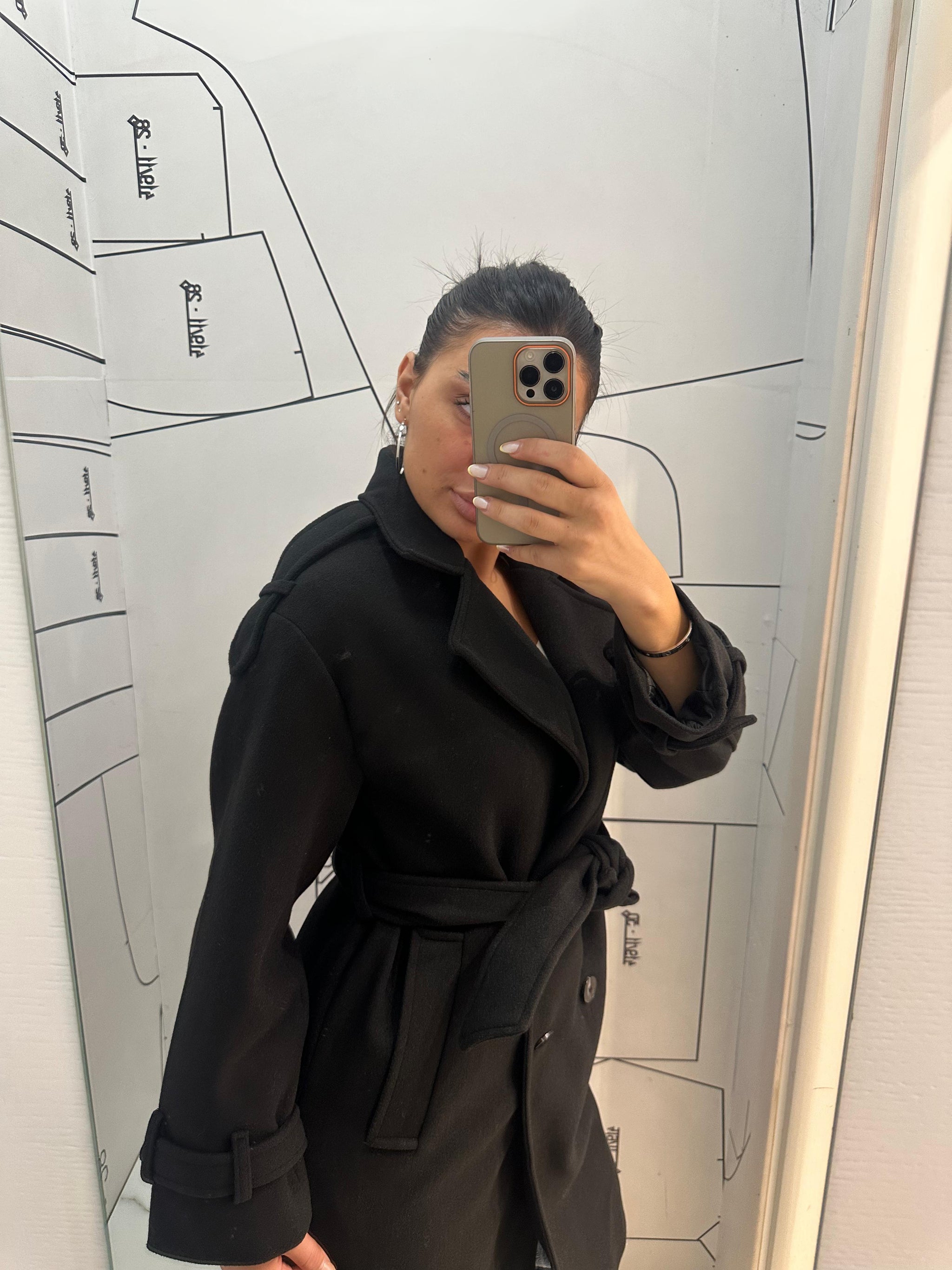 Elegantni crni kaput klasičnog kroja koji ističe vašu figuru uz dodatak pojasa za vezivanje u struku. Napravljen je od toplog i kvalitetnog materijala, idealnog za jesenje i zimske dane. Dužina ispod kolena i šik reveri daju mu sofisticiranu notu, dok detalji na rukavima dodaju moderni pečat.