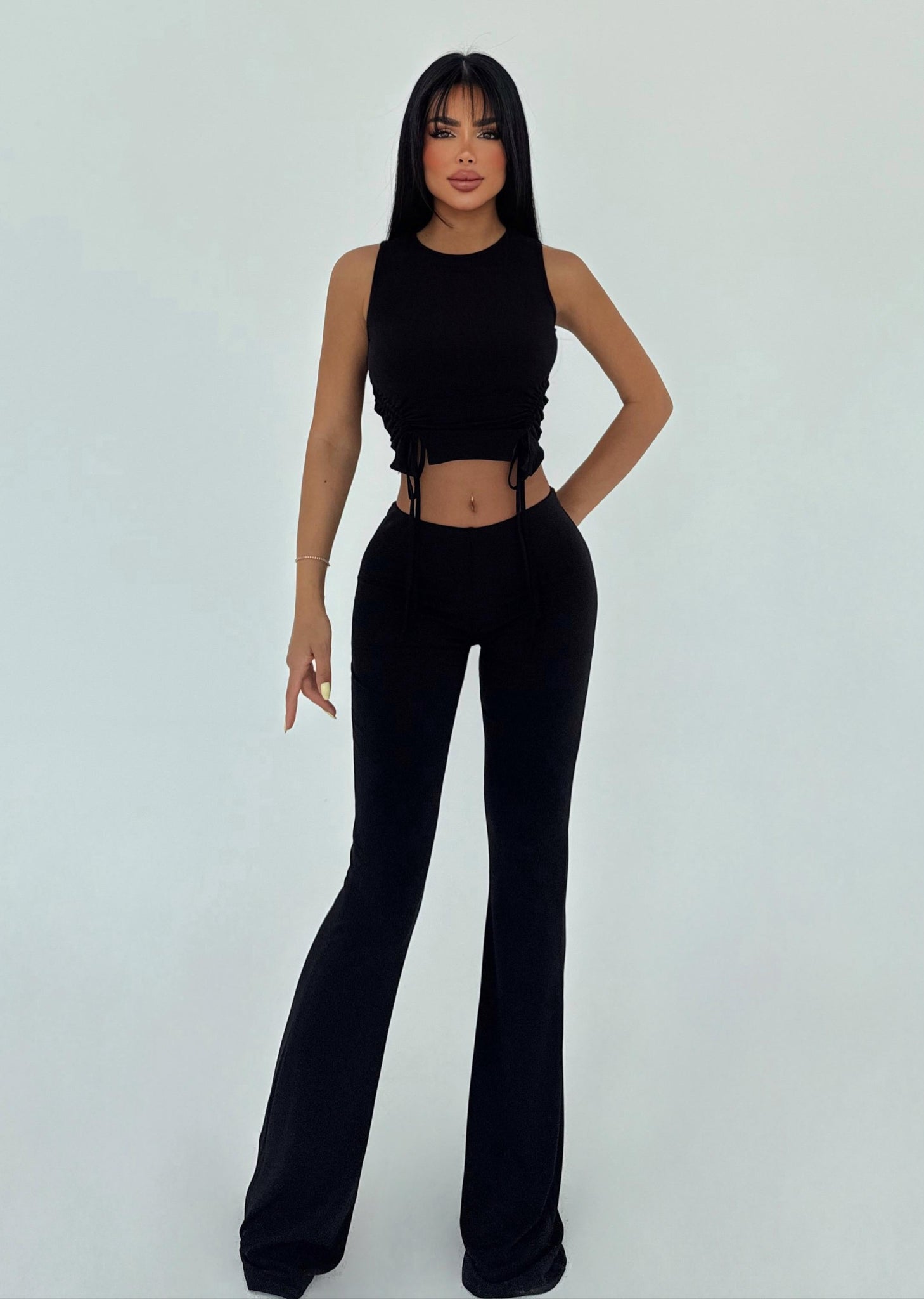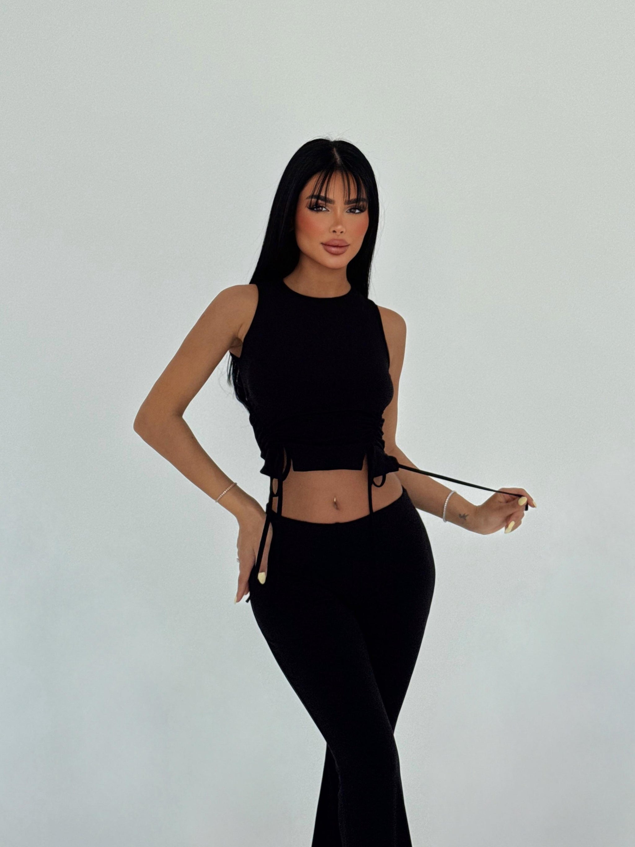 👚 Top sa vezivanjem sa strane ističe struk i prilagođava se tvom telu, dok elastične pantalone visokog struka oblikuju figuru i pružaju neodoljivo elegantan izgled.